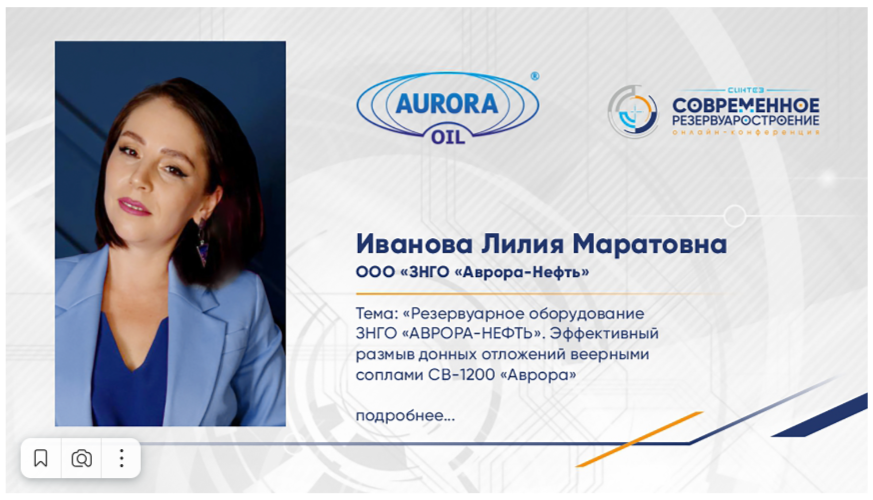 3 декабря 2025 года в рамках отраслевой онлайн-конференции «Современное резервуаростроение» представитель завода нефтегазового оборудования «АВРОРА-НЕФТЬ» Иванова Лилия выступила с докладом о запатентованной технологии борьбы с донными отложениями.